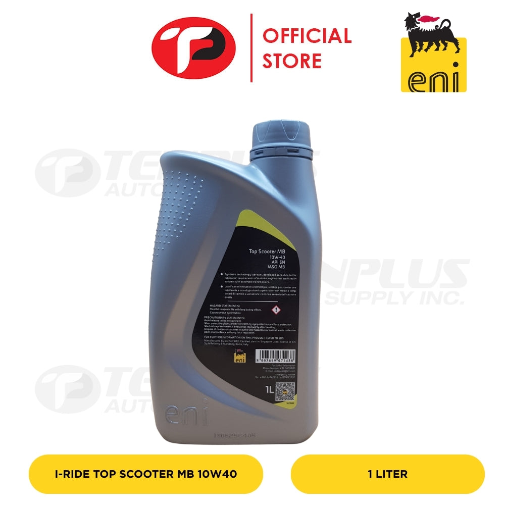 Eni i-Ride Top Scooter MB 10W40 is an innovative synthetic technology lubricant, developed according to the lubrication requirements of 4-stroke engines of scooters with automatic transmissions.